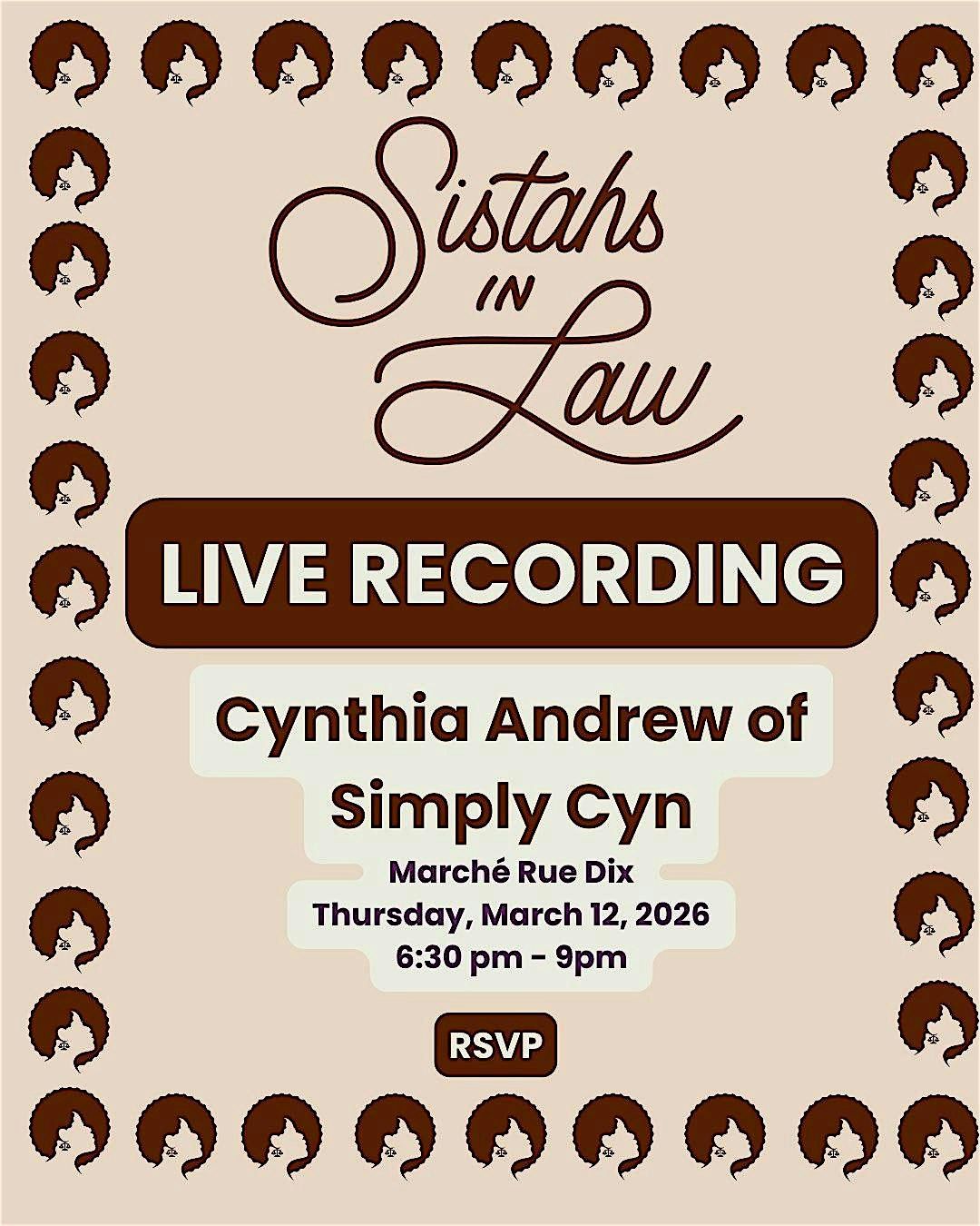Join the Sistahs in Law podcast community for a special live podcast recording featuring content creator and attorney Cynthia Andrew of SimplyCyn, hosted at the beautifully curated diasporic concept store, Marché Rue Dix.