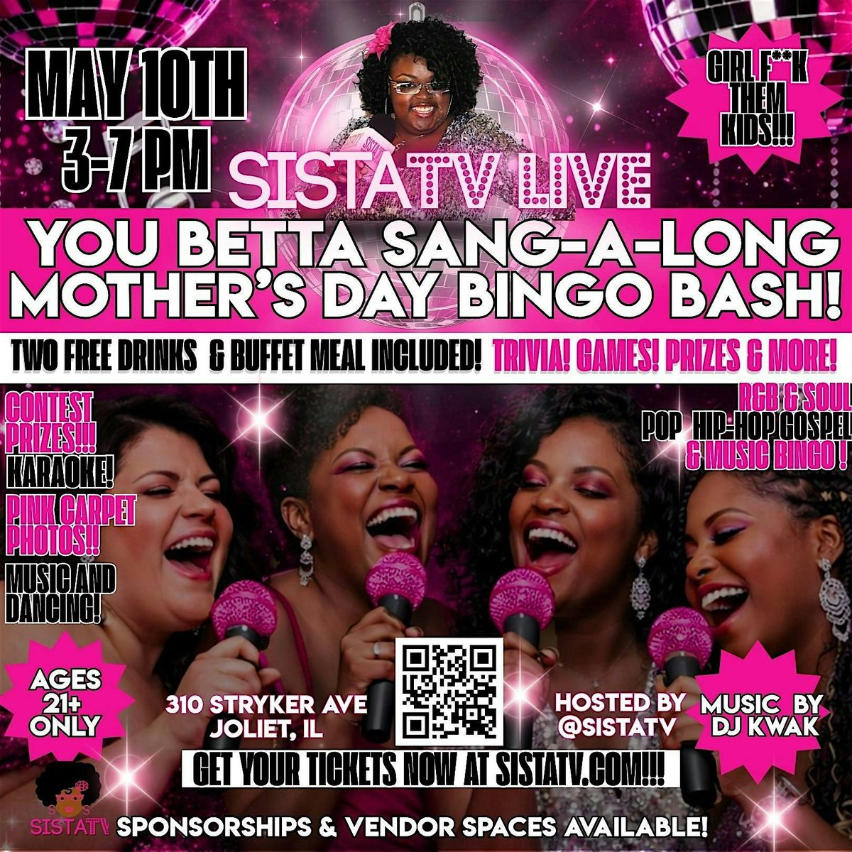 Girl... F--k Them Kids!! Leave them kids with their Daddy?! or their Grandma? Grandpa? Miss Rachel? Gracie & Nem? Girl... WHO CARES!! Not us... It's Mother's Day... It's OUR DAY! We gonna have us a TIME!! So Grab Ya Mama, Ya Besties, Ya Aunties, Your Man, Your Woman or whoever knows how to act and who knows how to have a REAL GOOD time and join Senam @SistaTV Amegashie for SISTATV LIVE:YOU BETTA SANG-A-LONG BINGO MOTHER'S DAY BINGO BASH! YOUR FULL MEAL AND TWO FREE DRANKS ARE INCLUDED !!