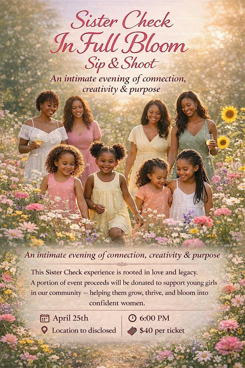Join us for In Full Bloom — A Sister Check Sip & Shoot Experience.