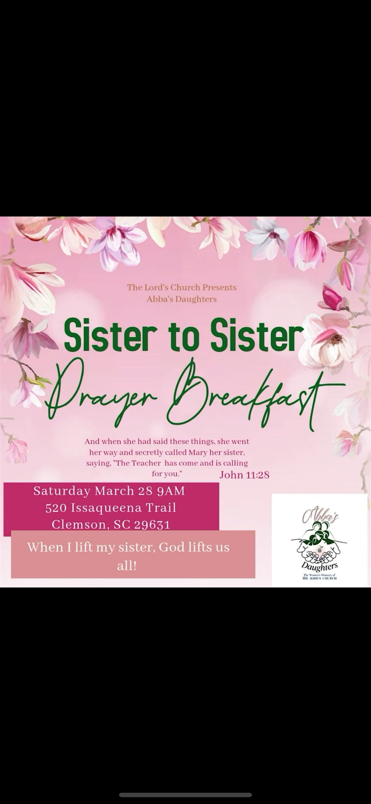 Join TLC Abba's Daughters for a sacred morning of sisterhood, and prayer! The Sister to Sister Prayer Breakfast is a holy gathering, where faith is shared, love is poured out, and burdens laid down. In prayer and around the table we will press in, contend for one another, and make room for the living presence of God. In this intimate space, expect renewal, breakthrough, and a powerful move of God. Alongside sisters, come ready to surrender, come expectant of change, and leave strengthened and transformed in Jesus Christ name.