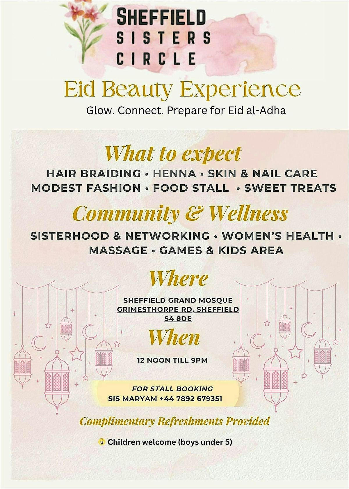 We are delighted to invite you to our Sisters Beauty Event, taking place on Monday 25th May at Sheffield Grand Mosque, in shaa Allah.
