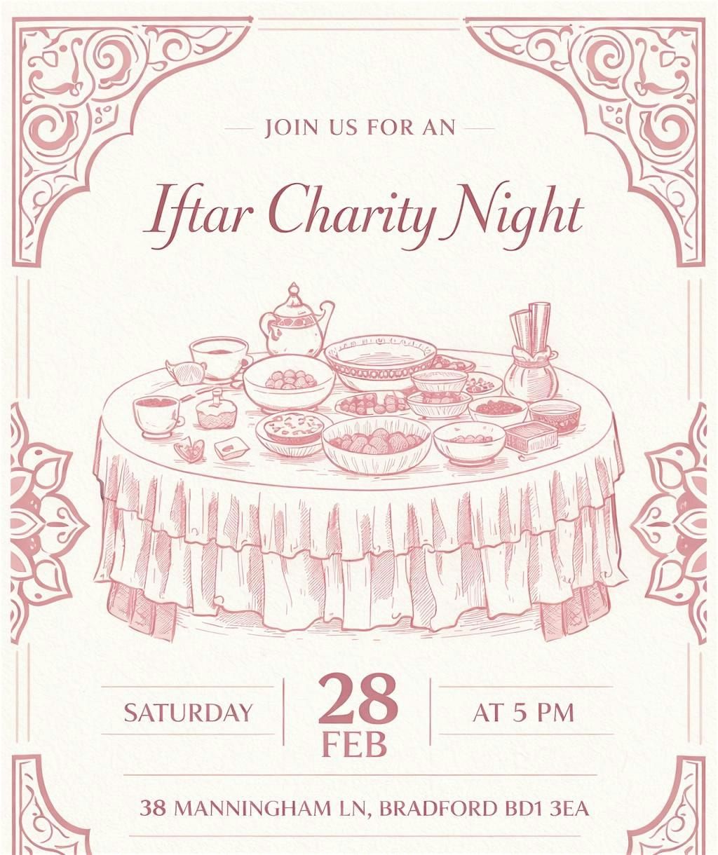 Welcome to the iftar charity night happening at PEARL Banqueting Suite BRADFORD on February 28, 2026 at 4:00 PM( SISTERS ONLY) . Join us, on a journey, for an evening of giving back and enjoying delicious food together. Let's come together to support those in need and make a positive impact in our community. Ticket price includes a 3 course meal, games, mini cake decorating and giveaways. Optional extras will include a mini pancake cart, a polaroid station, raffle draws, charity auctions, mehndi and much more.( prizes include make up, beauty treatments, and a pandora giftcard) LIMITED TICKETS AVAILABLE