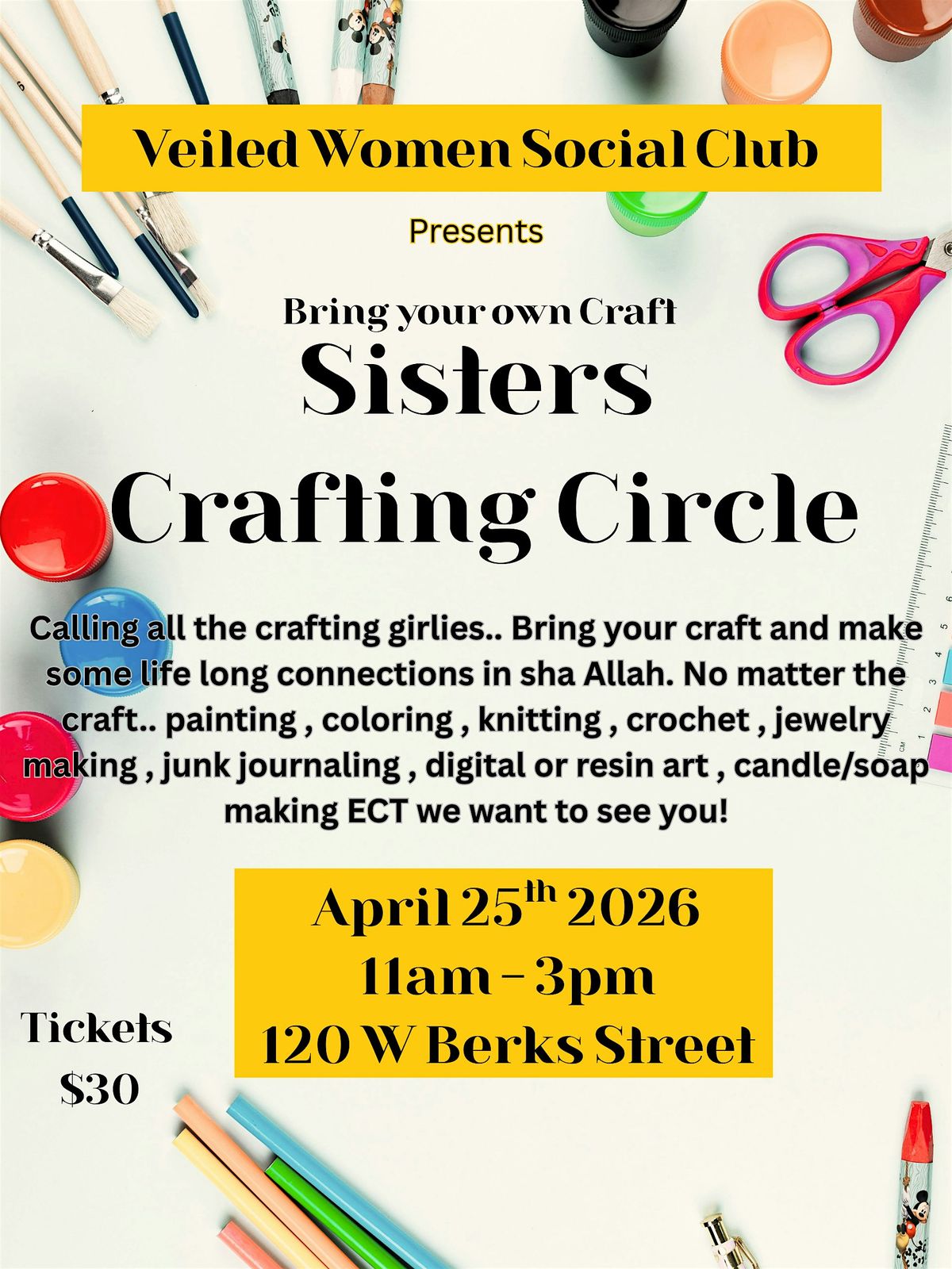 Calling all the crafting girlies.. Bring your craft and make some life long connections in sha Allah. No matter the craft.. painting , coloring , knitting , crochet , jewelry making , junk journaling , digital or resin art , candle/soap making ECT we want to see you!