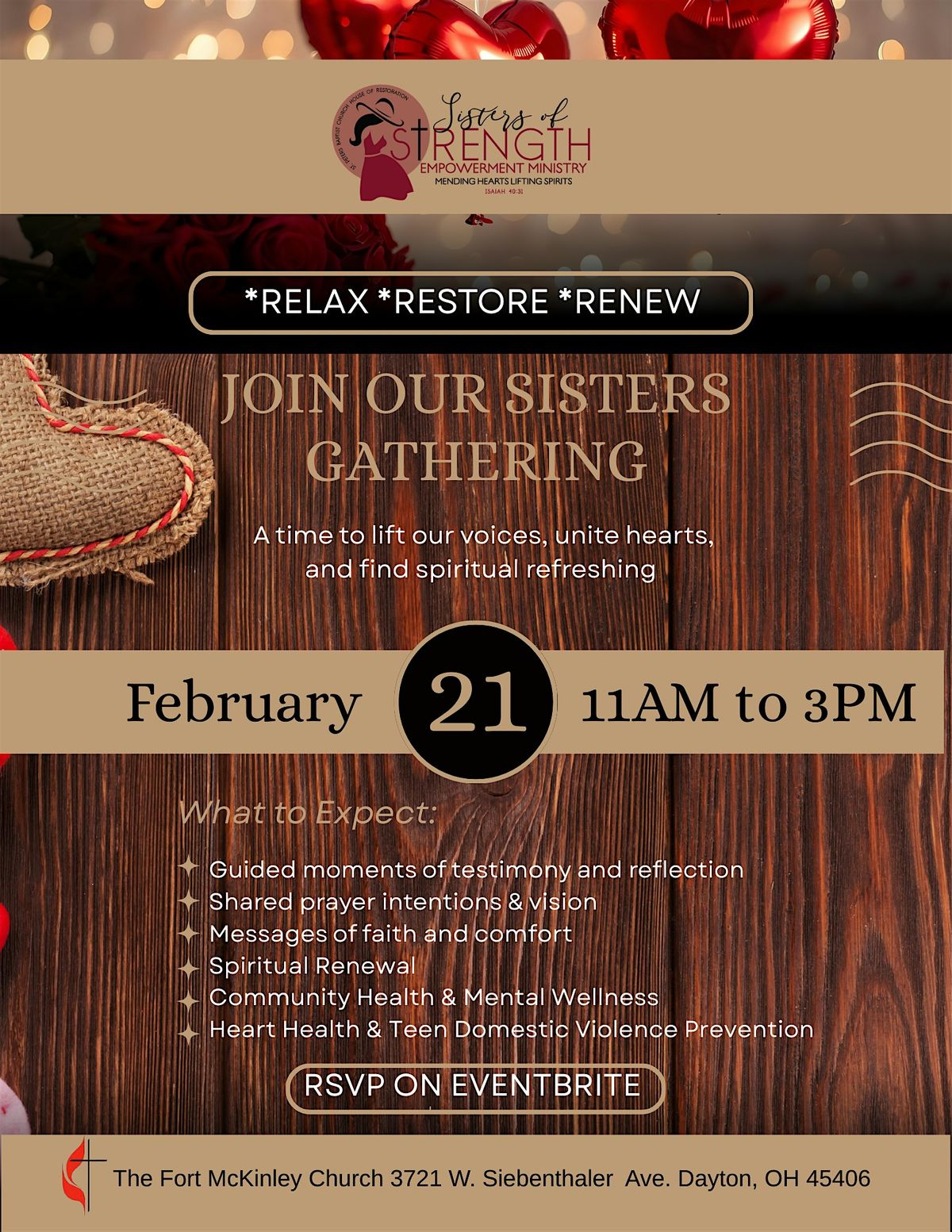 Sisters Gathering is a time of reflection, spiritual, mental reflection, and renewal. Women are invited to share experiences.