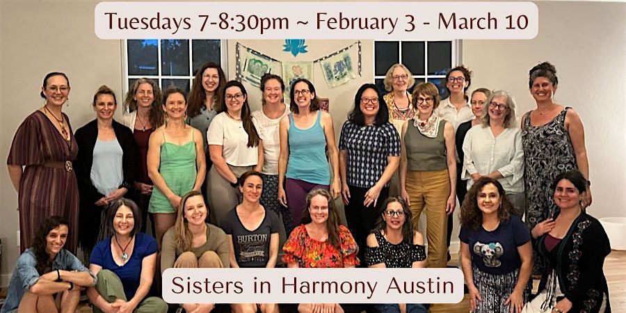 Sisters in Harmony Austin is a community of women who come together to explore singing as a resource for living fully. We practice freeing our voices as we learn lyrics, harmonies, layers, and parts. As we deepen our relationships with the songs, so too do our heart connections deepen with one another. Together we become a communal support system where we explore joy, grief, gratitude, sisterhood, authentic expression, and more through vocal expression and song. We practice sacred witness with each other, in a safe and brave container of song and exploration.