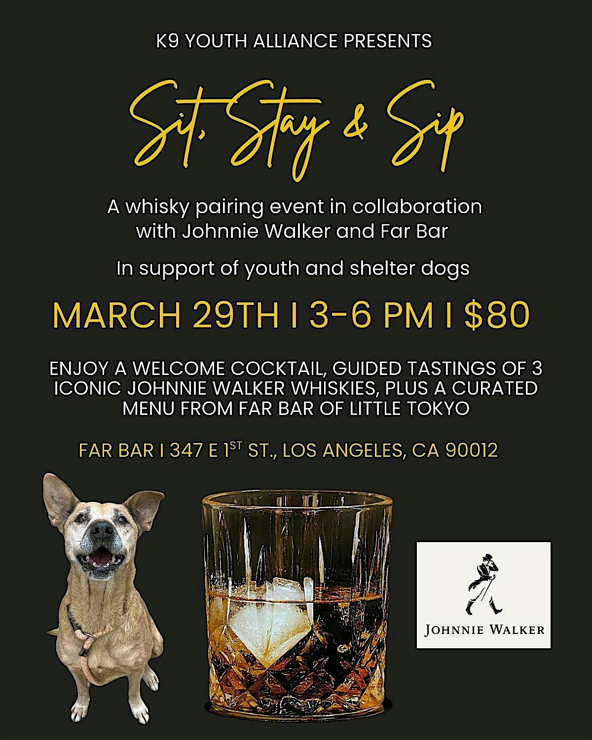 Join K9 Youth Alliance for an exclusive whisky pairing event. Guests will enjoy a welcome cocktail plus a special tasting of three iconic Johnnie Walker whiskies accompanied by a curated food pairing from Far Bar of Little Tokyo.