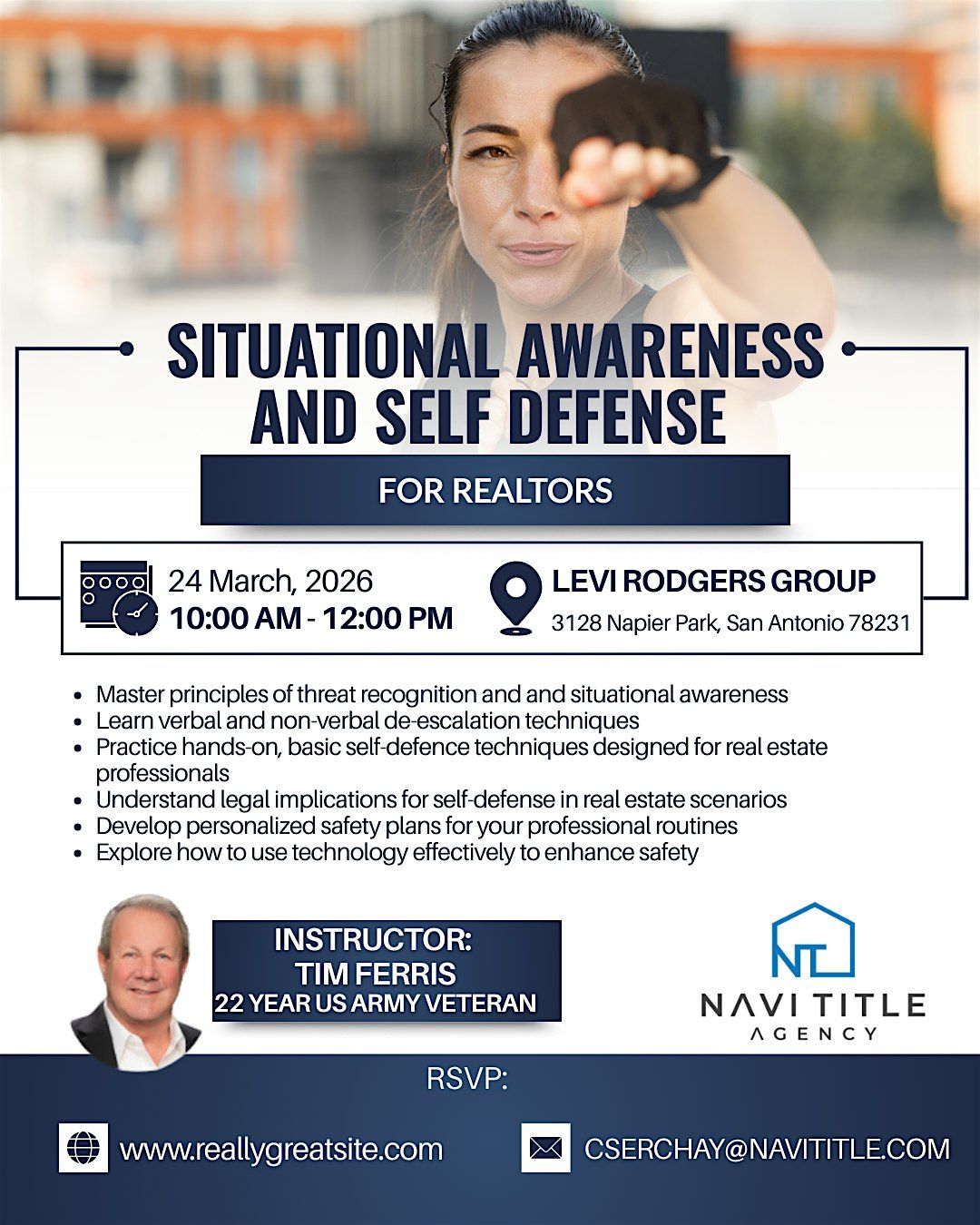 This hands-on Self-Defense & Situational Awareness Class will teach you how to: