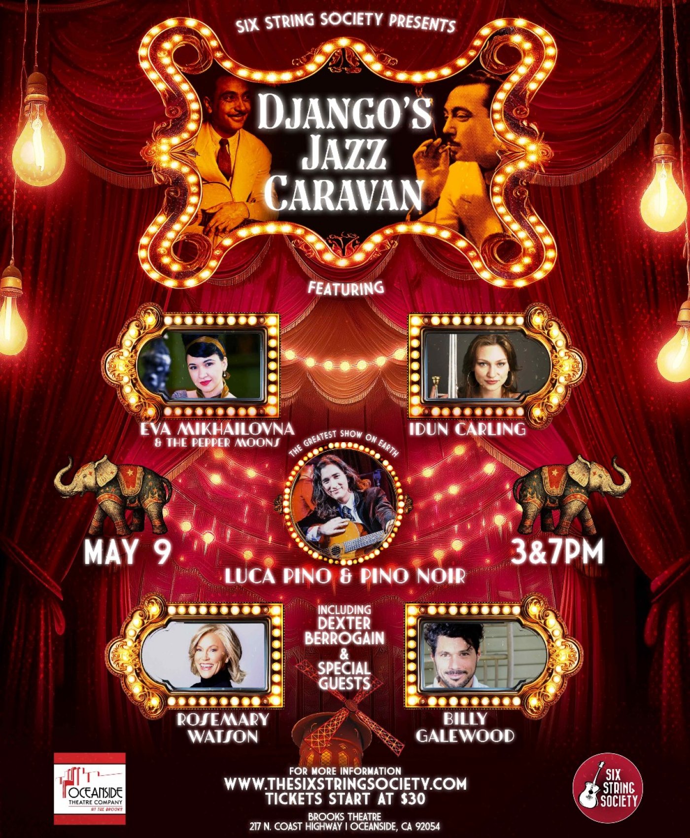 Come escape the ordinary with this modern-day Vaudeville act at the historic Sunshine Brooks Theater (217 N. Coast Highway, Oceanside, CA)! A night of fun-filled jazz on the mythical Moulin Rouge stage. Our international ALL STAR cast features Luca Pino, Eva Mikhailovna (and the Pepper Moons), Idun Carling, Rosemary Watson, Billy Galewood and Dexter Berrogain.