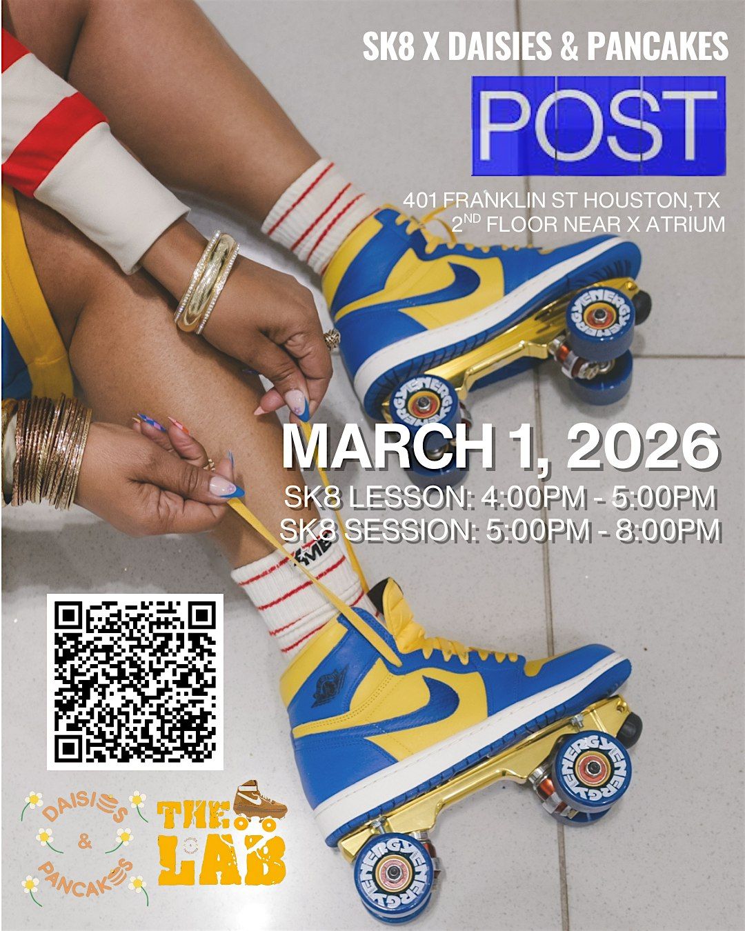 Join us for a fun day of skating at POST Houston! Lace up your skates and roll through for SK8 by Daisies & Pancakes. We'll be blending the best of both worlds: Dancing & Roller Skating. This will be an joyful event & a unique, one of a kind way that provides space to explore the wonders of roller skate.