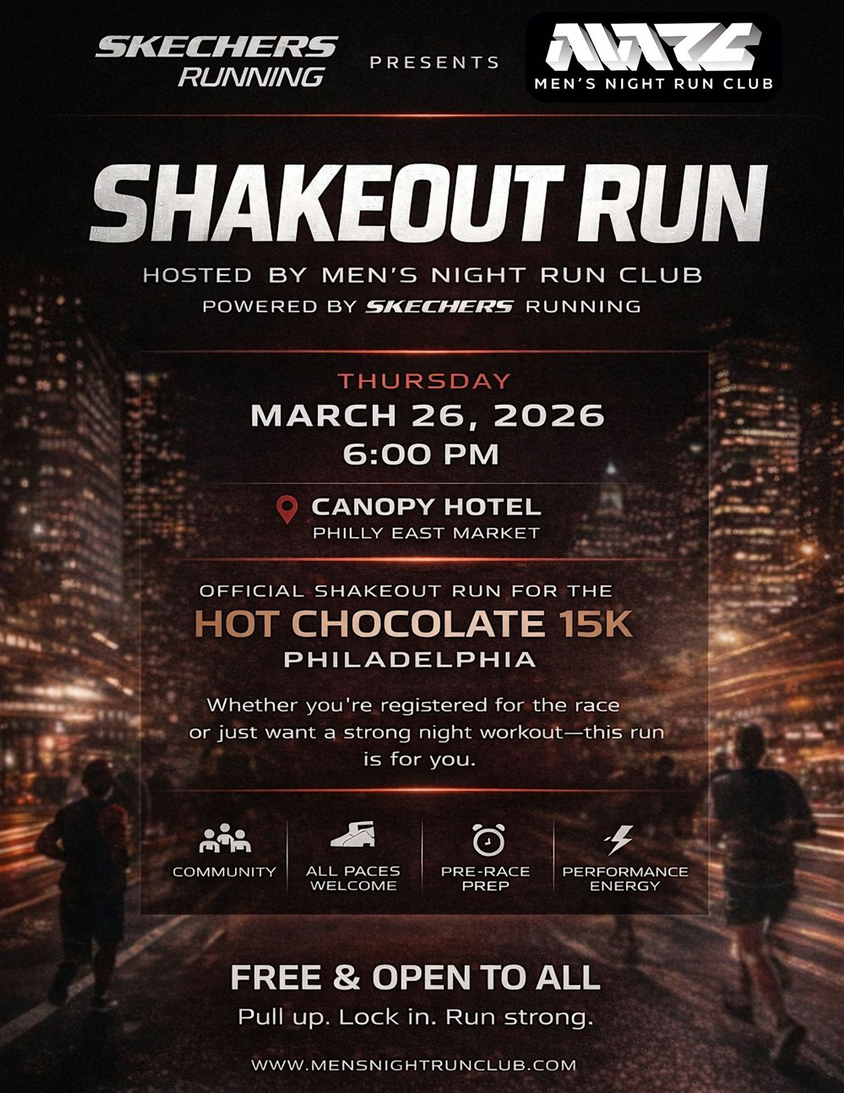 Men’s Night Run Club is teaming up with Skechers to host a special Shakeout Run ahead of the Hot Chocolate Run Philadelphia.