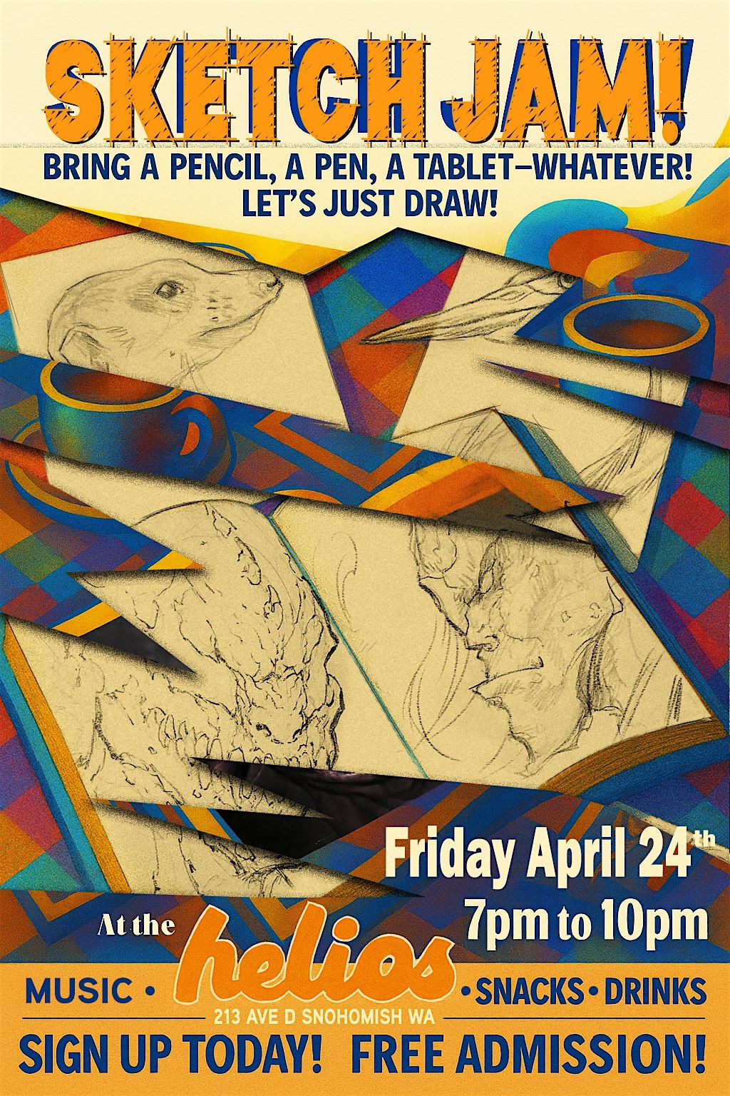 Join us for Sketch Jam at Helios, a casual creative gathering for artists of all levels. Bring a sketchbook, pencil, tablet, or whatever you like to draw with and spend the evening creating alongside other artists in a relaxed, welcoming space.