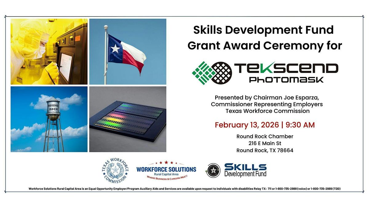 Hosted by Workforce Solutions Rural Capital Area, this Grant Award Ceremony recognizes for receiving a Skills Development Fund grant, an award that supports Texas employers in expanding job-related training for their workers. This funding helps companies strengthen employee skills, improve productivity, and stay competitive while creating long-term career opportunities for Texans.
