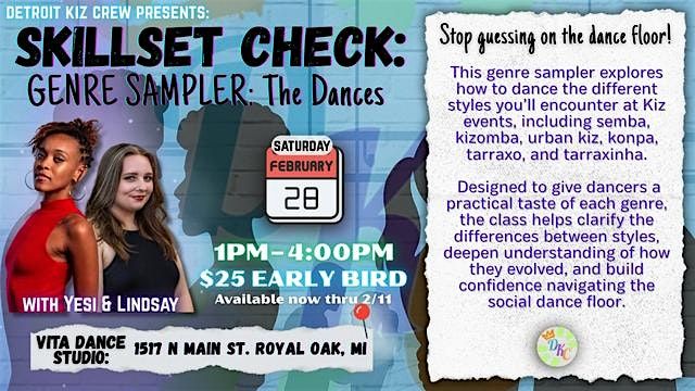 Skillset Check: Genre Sampler – The Dances is an in-person class experience designed to help dancers confidently navigate the different styles they’ll encounter at Kiz events. Instead of blending everything together, this session breaks each genre down so you can recognize, understand, and dance them with intention.