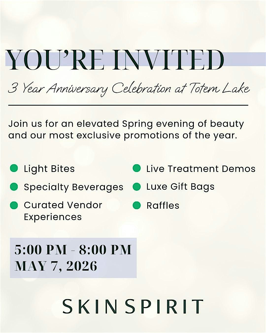 Come celebrate with us at SkinSpirit Kirkland (Totem Lake)! We're marking 3 amazing years of glowing skin and good vibes. Join the fun on May 7, 2026 at 5:00 PM (Pacific Time) for an evening full of surprises, promotions, light bites, specialty cocktails, and great company. Don’t miss out on this special anniversary event, see you there!