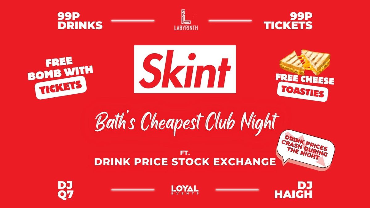 🥃 99p BOMBS EVERY WEEK🎟 99p TICKETS EVERY WEEK📉 Skint Drinks Stock Exchange🤑 BATH'S CHEAPEST CLUB NIGHT👕 FREE Skint T-Shirts🧀 FREE Cheese Toasties🔊 4 Rooms / 3 Music Policies❓ Skint Request Room - You choose, we play!🤩 1000's giveaways & freebies🥳 Crazy themes & takeovers🙌 Skint? WE GOT YOU! competitions🕒 OPEN UNTIL 3AM