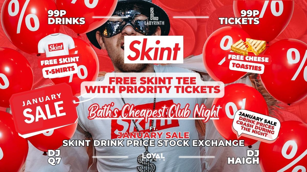 🥃 99p BOMBS EVERY WEEK🎟 99p TICKETS EVERY WEEK📉 Skint Drinks Stock Exchange🤑 BATH'S CHEAPEST CLUB NIGHT👕 FREE Skint T-Shirts🧀 FREE Cheese Toasties🔊 4 Rooms / 3 Music Policies❓ Skint Request Room - You choose, we play!🤩 1000's giveaways & freebies🥳 Crazy themes & takeovers🙌 Skint? WE GOT YOU! competitions🕒 OPEN UNTIL 3AM