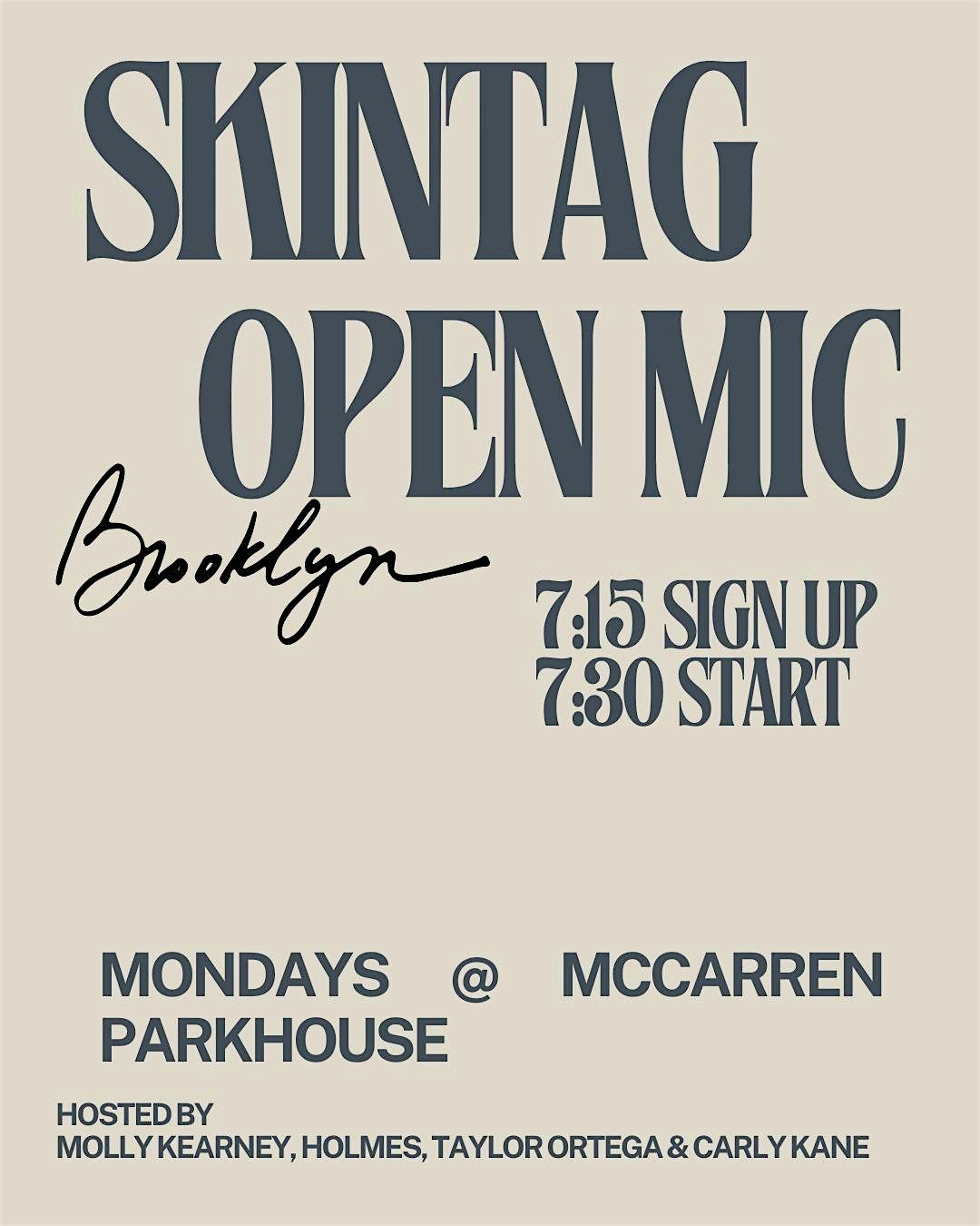 Skintag Comedy Open Mic is coming to Brooklyn! Every Monday at McCarren Parkhouse 7:15pm sign up, 7:30pm start.