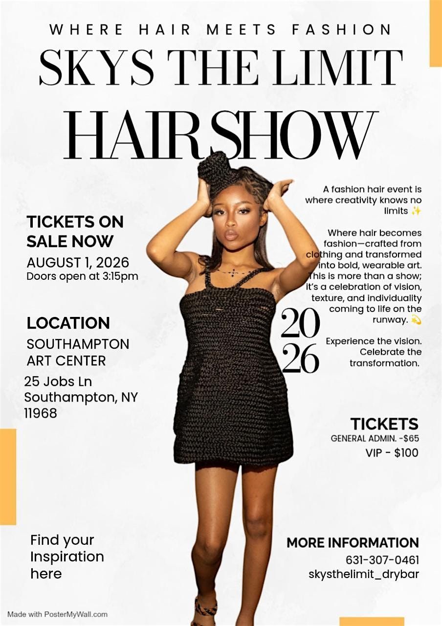 Welcome to the Skys The Limit Hair Show! DRESS TO EMPRESS! Get ready to be wowed by the latest hair trends and styles in this exciting event. Join us at the Southampton Arts Center for a day filled with hair inspiration, creativity, and fun. Watch talented hairstylists showcase their skills on the runway and see the amazing transformations they can create. Whether you're a hair enthusiast or just looking for some new ideas, this event is perfect for anyone who loves all things hair. Don't miss out on this fabulous opportunity to experience the magic of hair artistry up close! Top Long Island Stylist will be in attendance!!!!! Plus special guess.