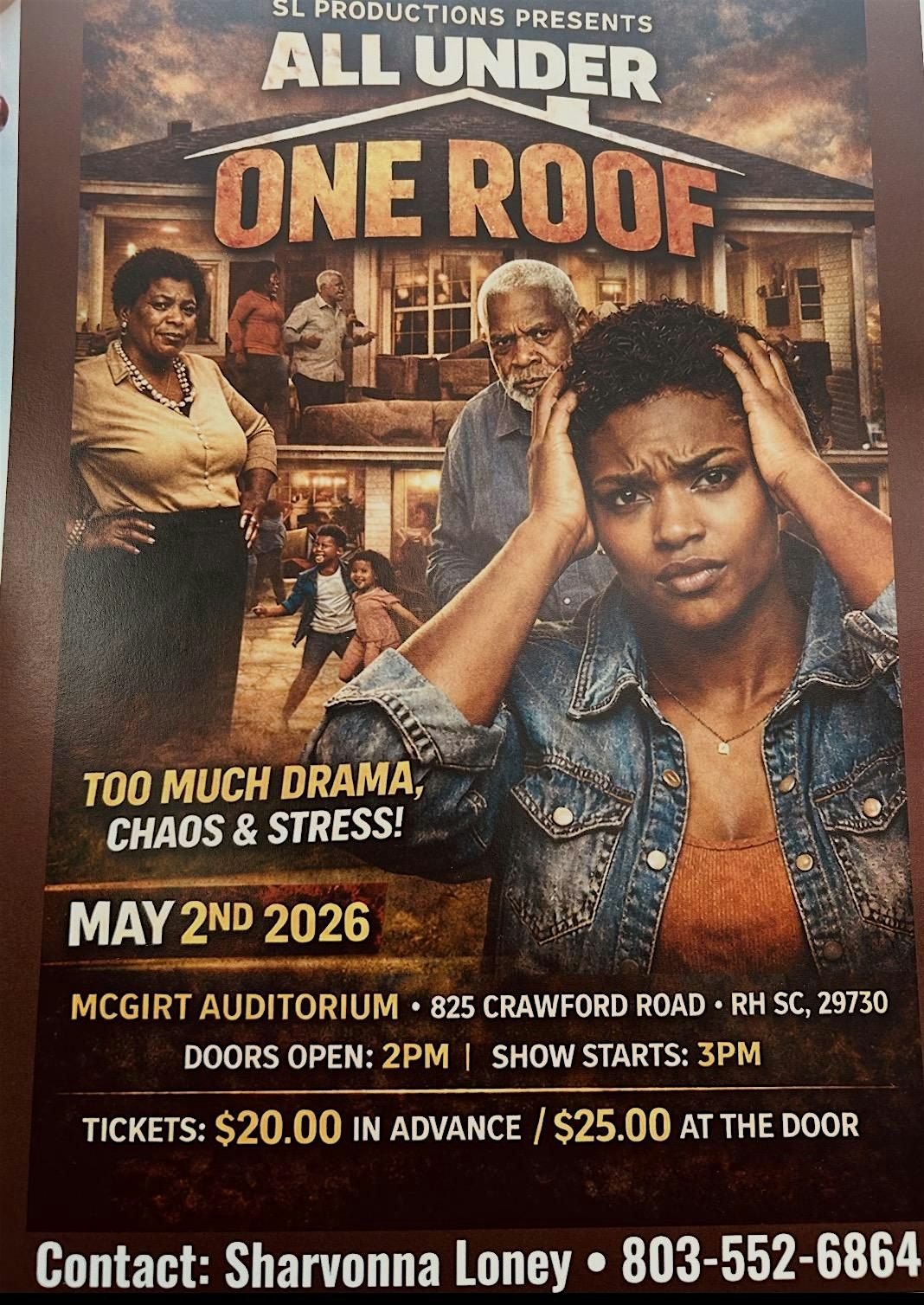 SL Productions Presents: All Under One Roof — a powerful, emotional, and unforgettable stage play that brings family, faith, and real‑life challenges to the forefront. This production invites you into the heart of a household where love is tested, secrets surface, and healing becomes possible.