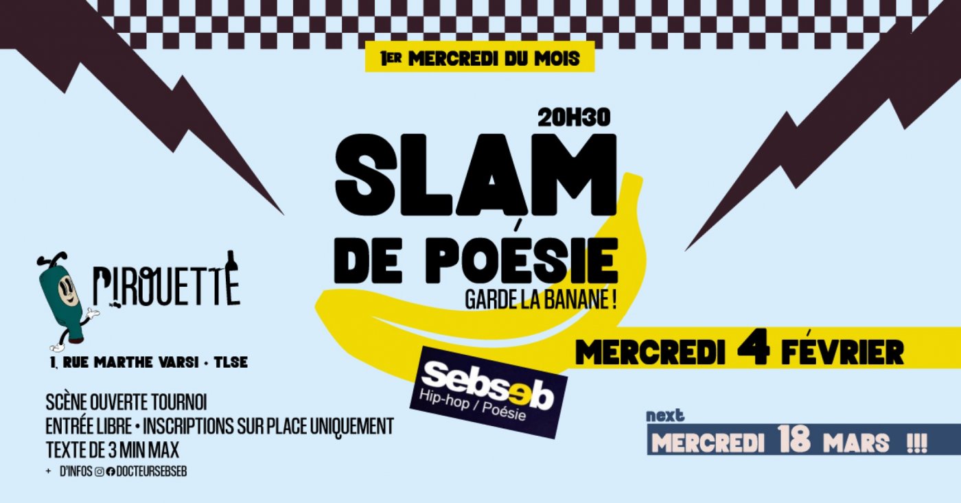 Le slam est un modèle de scène ouverte, proposée dans les années 80 par Marc Smith à Chicago. Un texte de 3 minutes maximum, sans décor, sans costume ou accessoire. A cappella !
