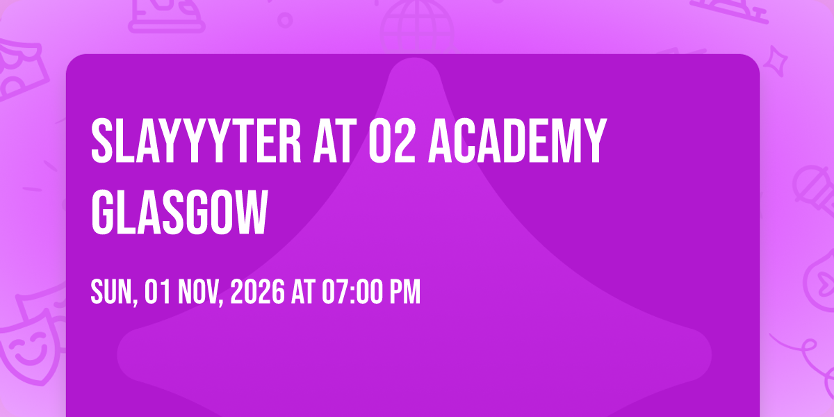 🎉 Welcome to Slayyyter at O2 Academy Glasgow, where dreams come alive and possibilities are endless! 🏛️ Join us at O2 Academy Glasgow in the heart of Glasgow, SC for an event that defies expectations. 📅 On November 1st, 2026 at 07:00 PM, be part of something truly extraordinary as we bring together innovation, entertainment, and pure magic. ✨ Every aspect has been carefully designed to ensure an unforgettable experience for all our guests. Whether you're seeking adventure, inspiration, or simply a break from the ordinary, this event promises to deliver beyond your wildest dreams. 🎊 Prepare for a journey into the extraordinary!