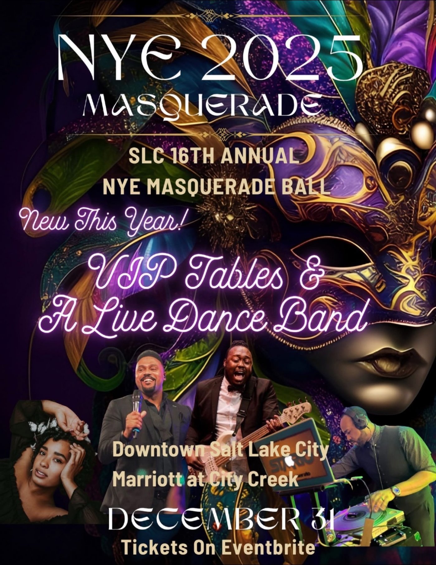 Step into a night of opulence as you don your finest attire and gracefully conceal your identity behind your beautifully crafted mask. This event features live entertainment cash bars complimentary party favors and lots of champagne shimmering with effervescence promising a toast to the night ahead. Be sure to wear your best mask meticulously designed to add an air of mystique this event epitomizes the allure and excitement of the SLC-NYE Masquerade Ball.