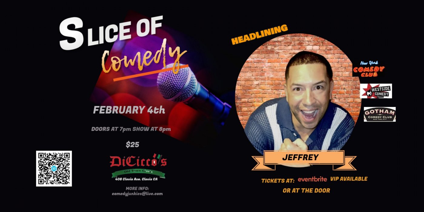 Slice of Comedy is back with a night of laughs headlining Jeffrey! Join us at Di Cicco's Italian Restaurant on February 6, 2026 at 8:00 PM (Pacific Time). Get ready for a hilarious evening filled with jokes and good vibes. Don't miss out on this chance to unwind and enjoy some quality comedy. See you there!