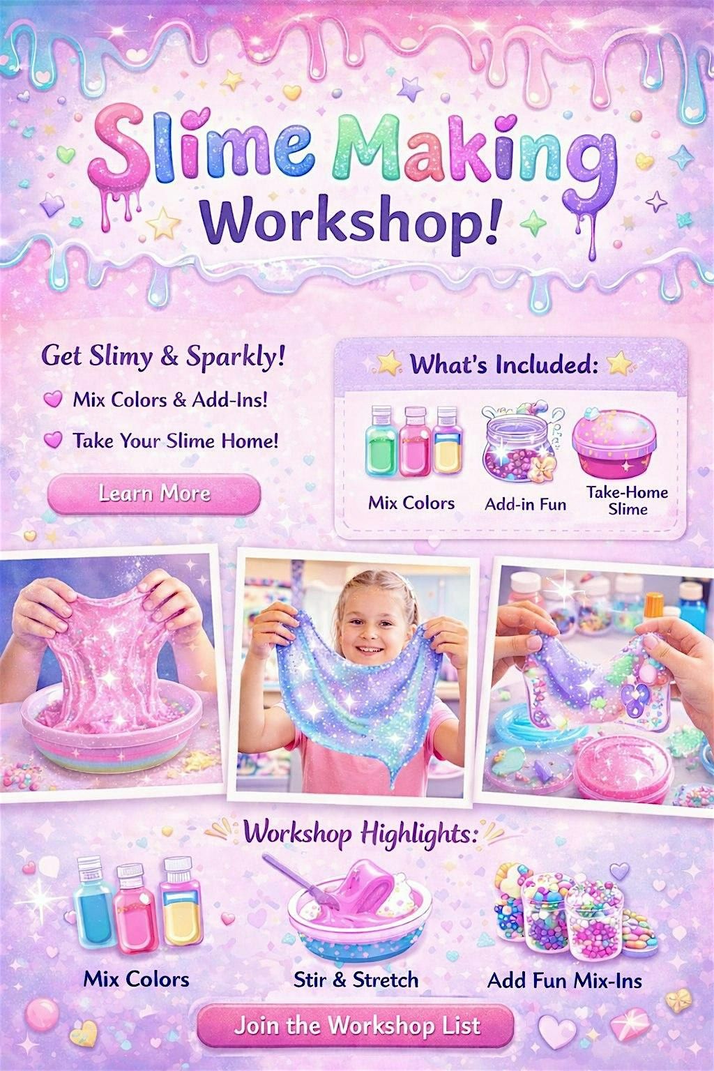 Participants will choose their slime colors, add sparkly mix-ins and textures, and learn how to make the perfect stretchy slime — all guided by our team. Each child will leave with a sealed take-home container of slime they created themselves.