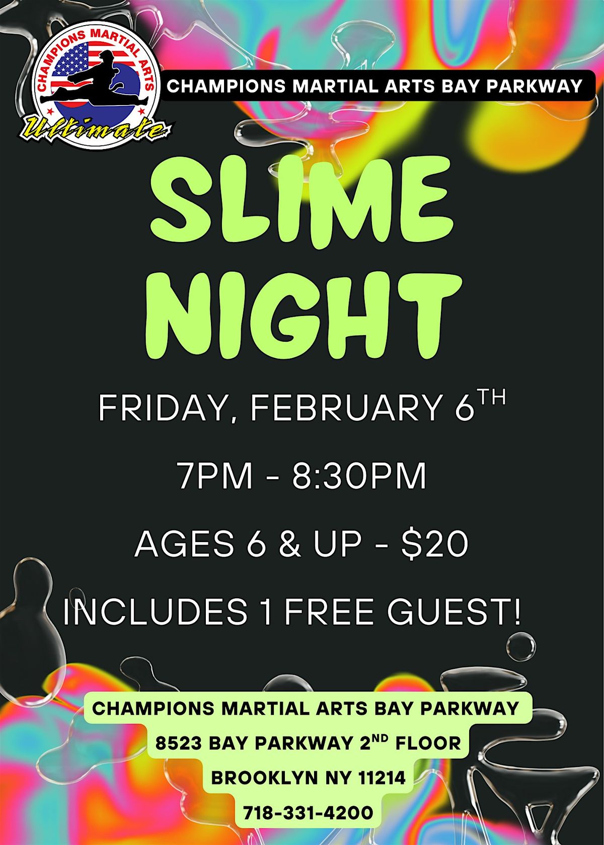 Kids will mix, customize, and play with slime, participate in games, and socialize in a safe, fully supervised environment led by our experienced Champions Martial Arts staff.
