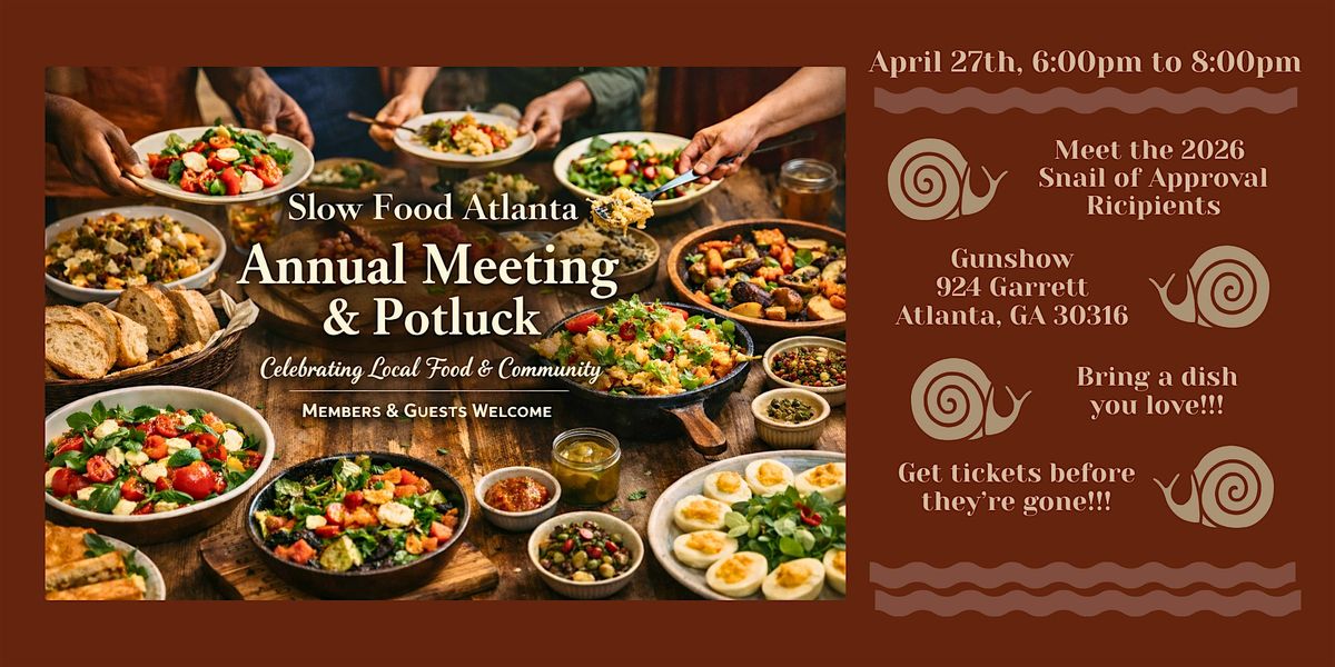 Join us Monday, April 27th from 6-8pm for our Annual Meeting and Potluck at Gunshow, a special evening celebrating community, good food, and recipients of the 2026 Snail of Approval award!