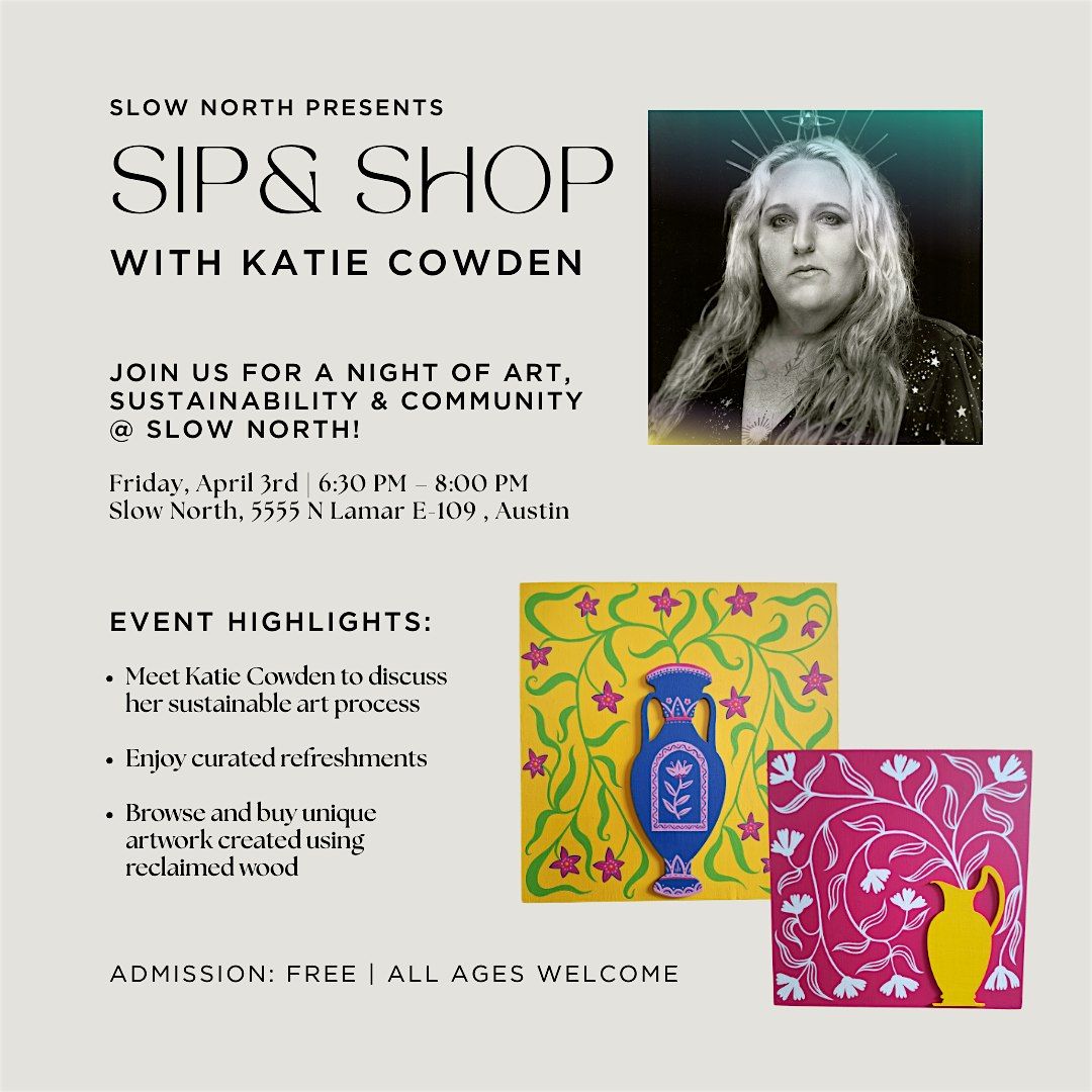 Join us at Slow North on April 3, 2026 at 6:30 PM for a fun evening of sipping, shopping, and art with Katie Cowden! Come hang out, discover unique finds, and enjoy great company in a relaxed vibe. Don't miss this chance to mix, mingle, and shop local. See you there!