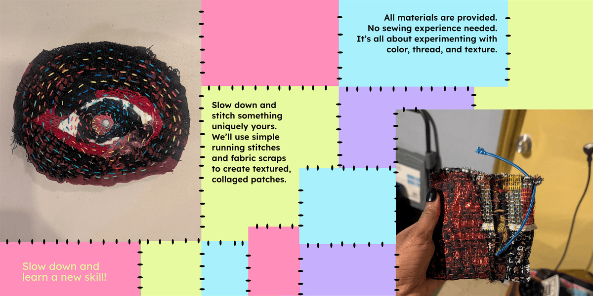 Join us for a relaxed, hands-on session where you'll dive into the art of slow stitching. Perfect for anyone who loves to create and unwind, this in-person event lets you explore texture and layering by crafting your own unique collage. Bring your creativity and enjoy a chill atmosphere filled with fabric, threads, and good vibes. No rush, just stitching and fun! All Materials Provided.