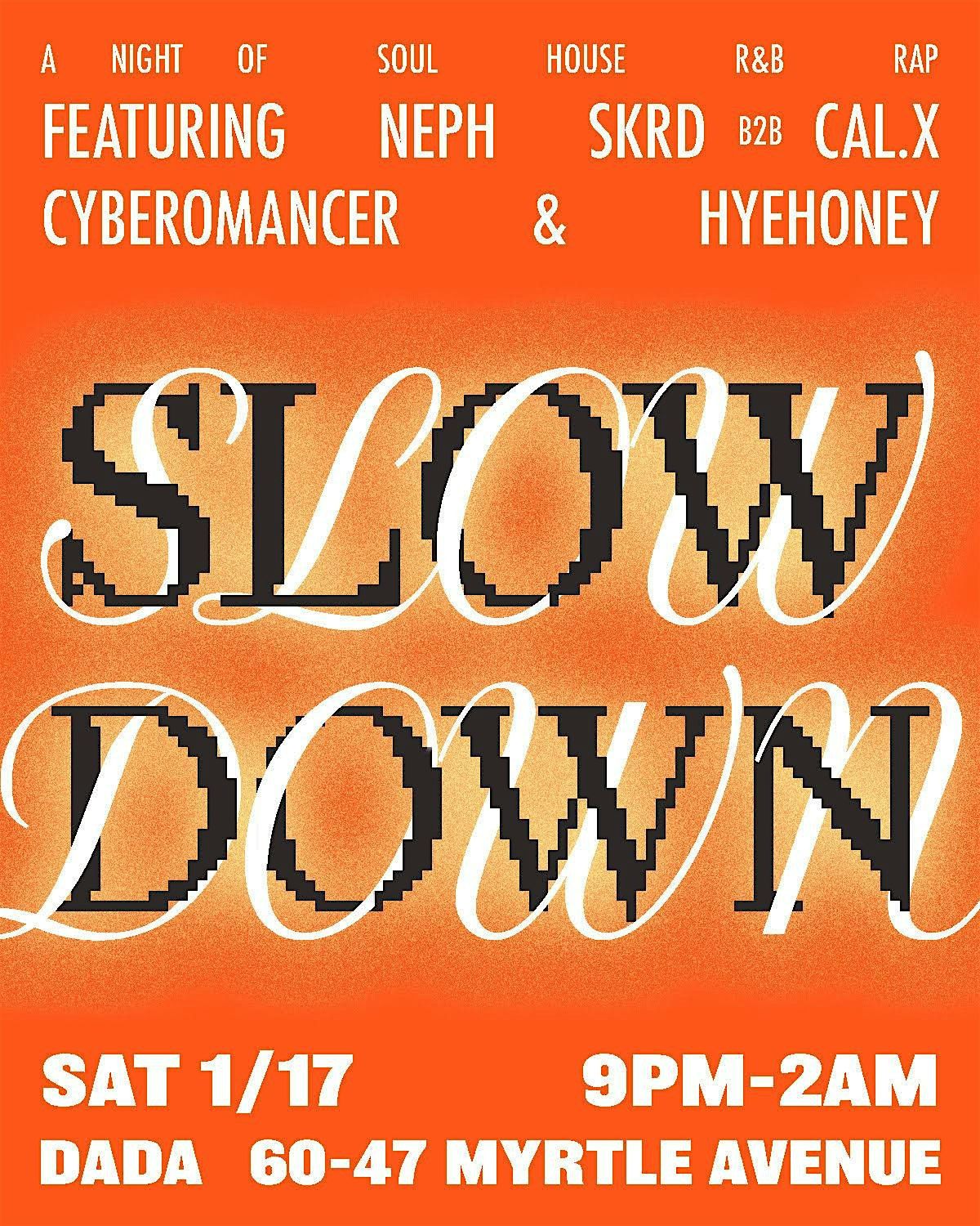 SLOWDOWN – An exploration of the sounds that inspired the future. We’ll be cycling through vinyl and digital tracks that unite our hip-hop community, featuring samples and reference tracks from old soul, R&B, and classic house music. This will be a community-driven night aimed at bringing the scene together through the lens of our group, ASF. Our goal is to create an ecosystem of like-minded creatives who can connect, collaborate, and grow together. There will be many references to Quiet Storm radio station throughout the night with the flyer drawing inspiration from the 70s-90s style late night radio.