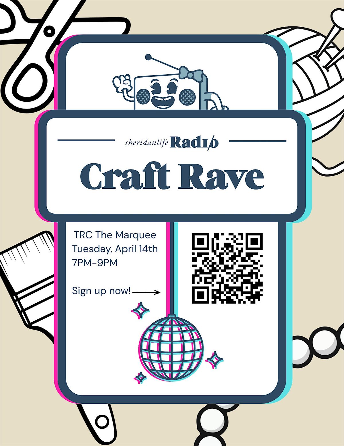 Join Sheridanlife Radio on April 14th from 7 PM – 9 PM for a high-energy Craft Rave designed to help you power through projects, unwind, and connect with fellow students.
