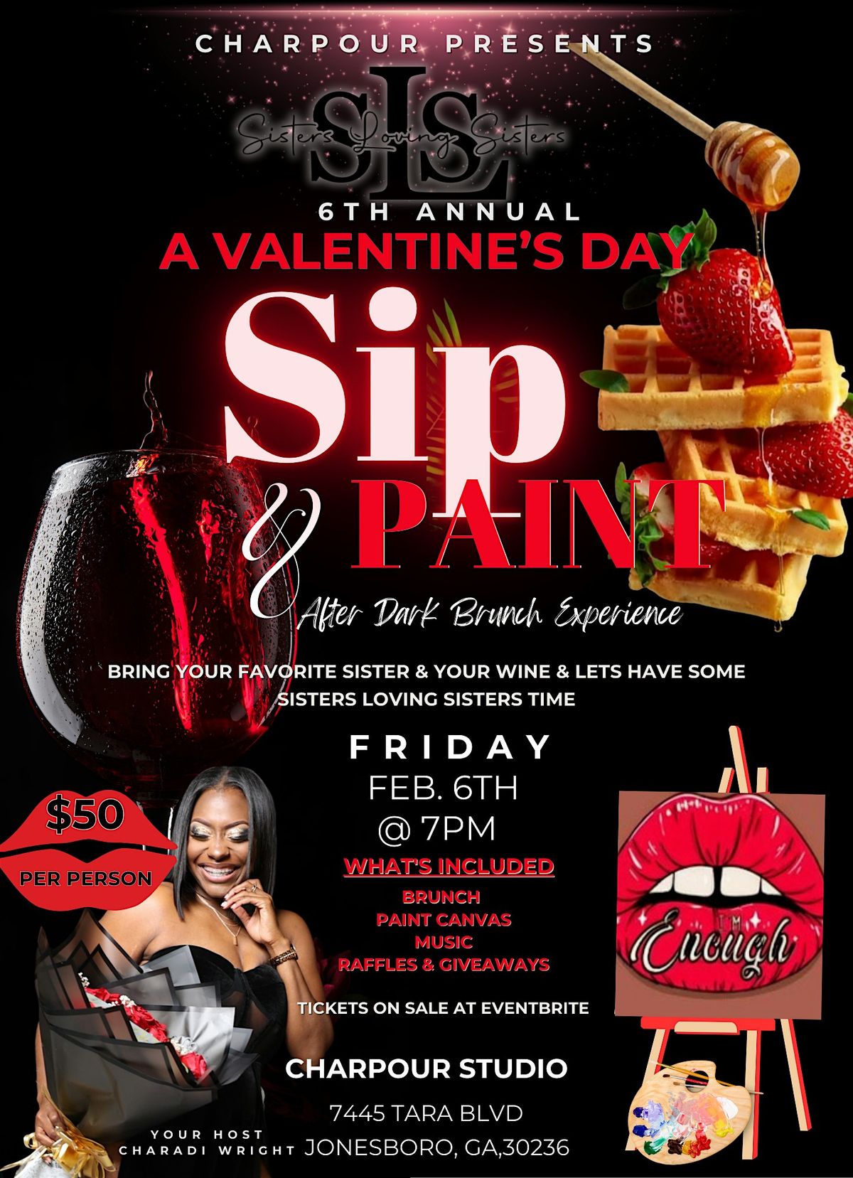 Hosted at CharPour Studio in Jonesboro, Georgia, this elevated sip and paint event brings together art, brunch bites, music, wine, and sisterhood in a chic after-dark atmosphere. Whether you’re celebrating Valentine’s Day with friends or just looking for a unique girls’ night out, this experience is for you.