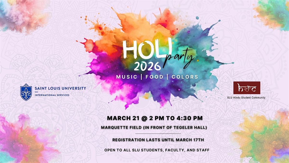 The Office of International Services with the Hindu Student Community, are once again hosting their campus-wide Holi celebration! Join us on Saturday, March 21st from 2pm-4:30pm at Marquette Field (in front of Tegeler Hall) for colors, music, food, and dancing! This free event is open to all SLU students, faculty, and staff (domestic and international)!