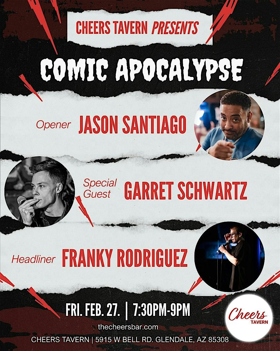 🎤 Get ready for a night of laughs at Comic Apocalypse! Join us on Friday, February 27, from 7:30 PM to 9:00 PM at Cheers Tavern (5915 W Bell Rd, Glendale, AZ). 🎤🎭