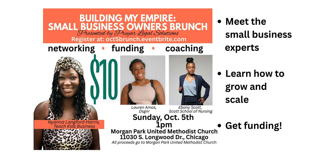 Welcome to the Small Business Owners Brunch sponsored by Preyar Legal Solutions, LLC! Join us at Morgan Park United Methodist Church for an afternoon filled with networking, delicious food, and inspiring success stories.