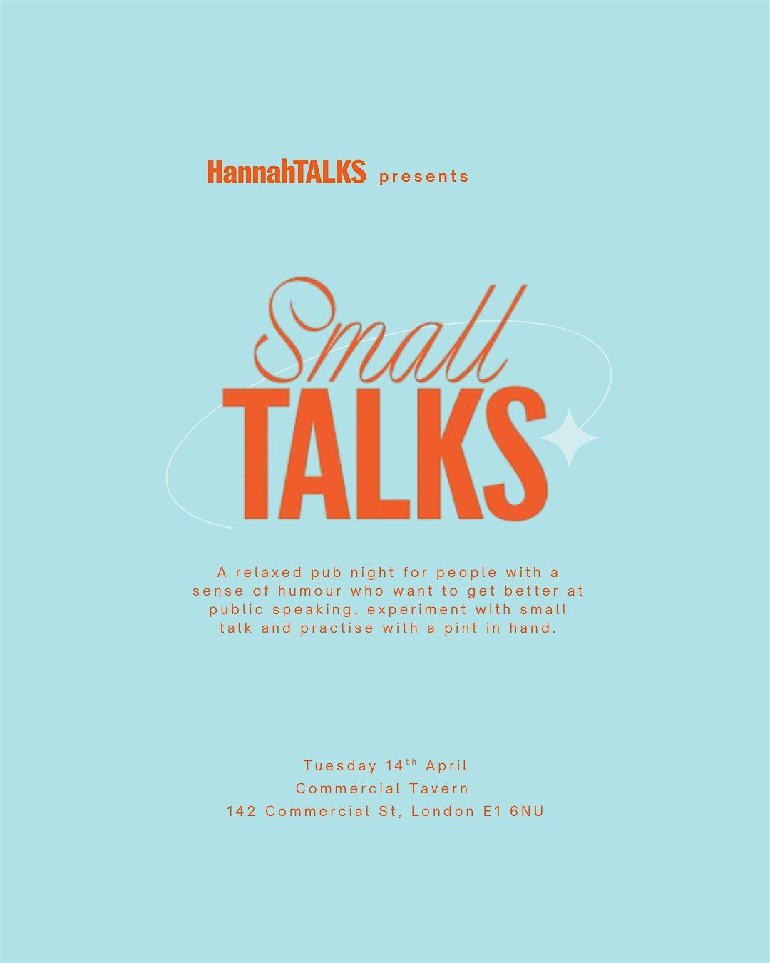 WELCOME to SmallTALKS! I wanted somewhere to practise speaking with strangers - I tried a few events – some were too stiff and structured, others were so unstructured there was no learning – so I’ve put together the middle ground I was looking for. It’s a relaxed pub night where you can experiment with small talk, hear a short talk from normal people who actually present at work, pick up practical tips, and have a go yourself if you’re feeling brave. It’ll feel like chatting to friends, with a pint in hand if that helps!