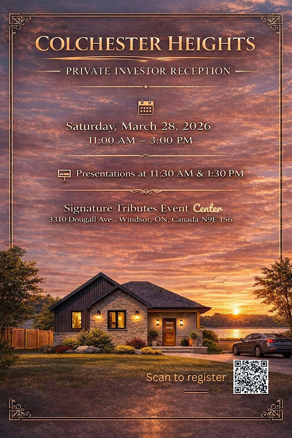 Join us for an exclusive reception for Colchester Heights, a modern raised ranch community with dual-unit living and strong income potential. Discover the project, explore opportunities in the Windsor market, and connect with fellow buyers, investors, and industry professionals in a welcoming, social setting.