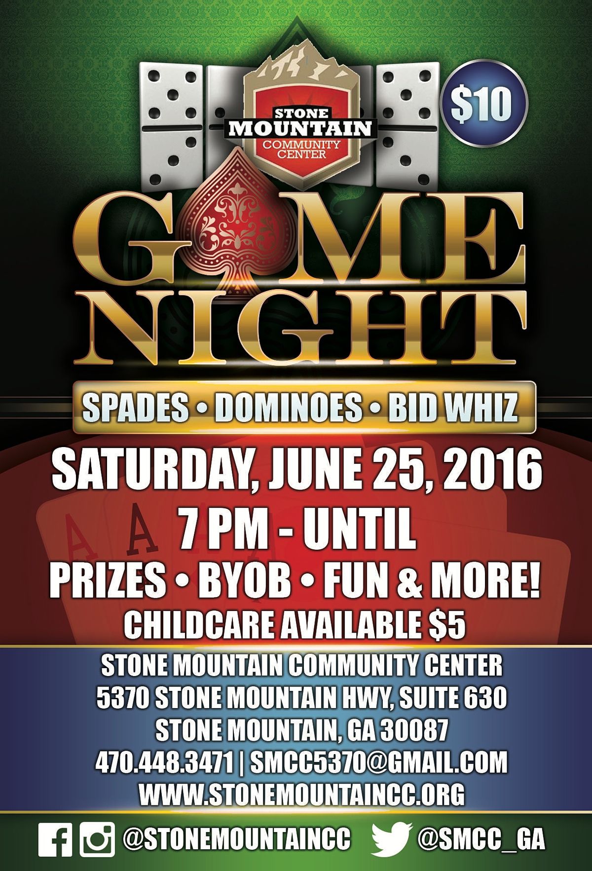 Spades, dominoes, bid whiz, BYOB. Childcare available for $5.