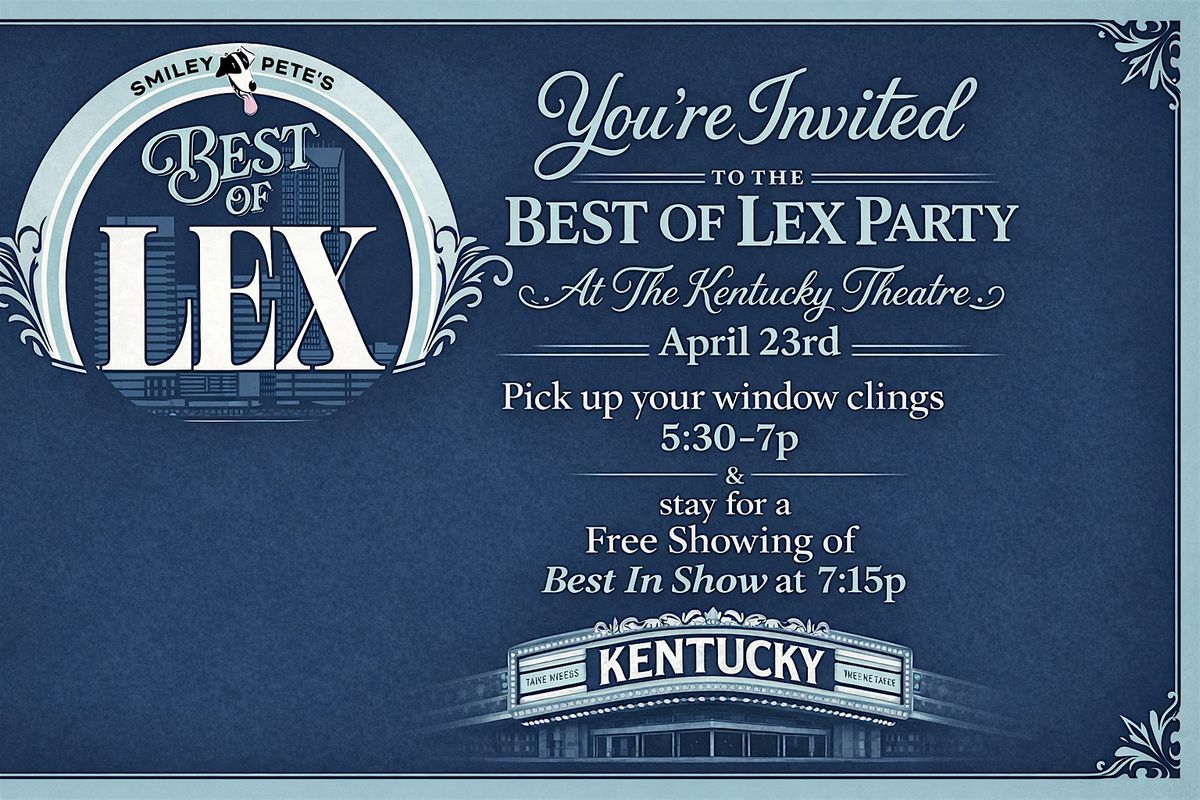 Celebrate Smiley Pete's 3rd annual Best of Lex winners on April 23 from 5:30–7 PM at the Kentucky Theatre! Grab your copy of the Best of Lex issue, winners may claim your window cling, and bring your coworkers, friends, family, and kiddos for a free 7:15 PM screening of Best in Show.