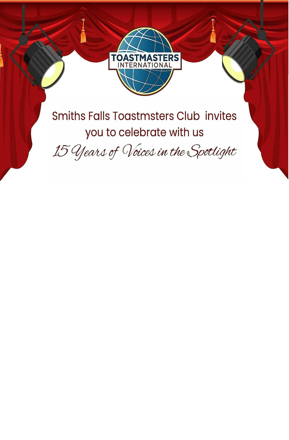 Join us in person to celebrate 15 awesome years of the Smiths Falls Toastmasters Club!About this Event