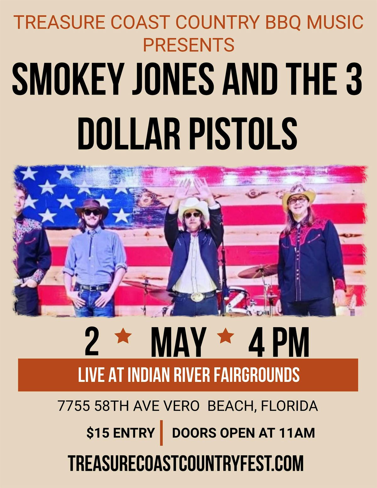 Don't miss out on an epic in person night with Smokey Jones and The 3 Dollar Pistols. Come hang, enjoy some killer tunes, and soak up the live vibes. It’s gonna be one wild ride you won't forget! Our band has toured nearly a decade all over the US, puts on a high energy country show with multiple decades of hits. Based in Atlanta but have a good show history in Florida and played the Florida State Fair this year, as well as many other large Florida dates last year. We have opened for many country music icons over the years and have a world class group of musicians.