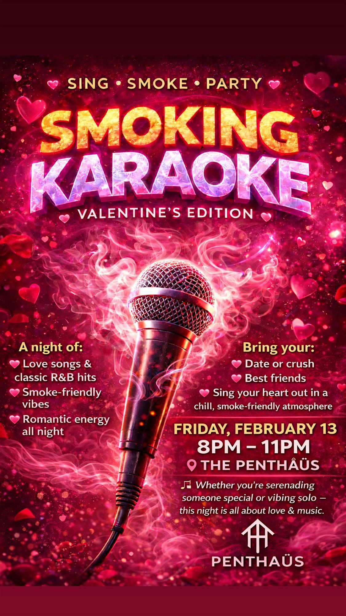 Sing, smoke, and fall in love with the mic ❤️ Valentine’s Smoking Karaoke—R&B vibes, love songs, and a chill night at Penthaus.