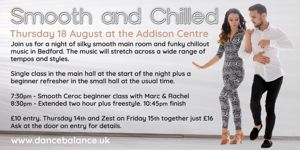 Join us for a night of silky smooth main room and funky chillout music in Bedford. The music will stretch across a wide range of tempos and styles. We start with a smooth Ceroc beginner class in the main hall at the start of the night, plus a beginner refresher in the small hall at the usual time.