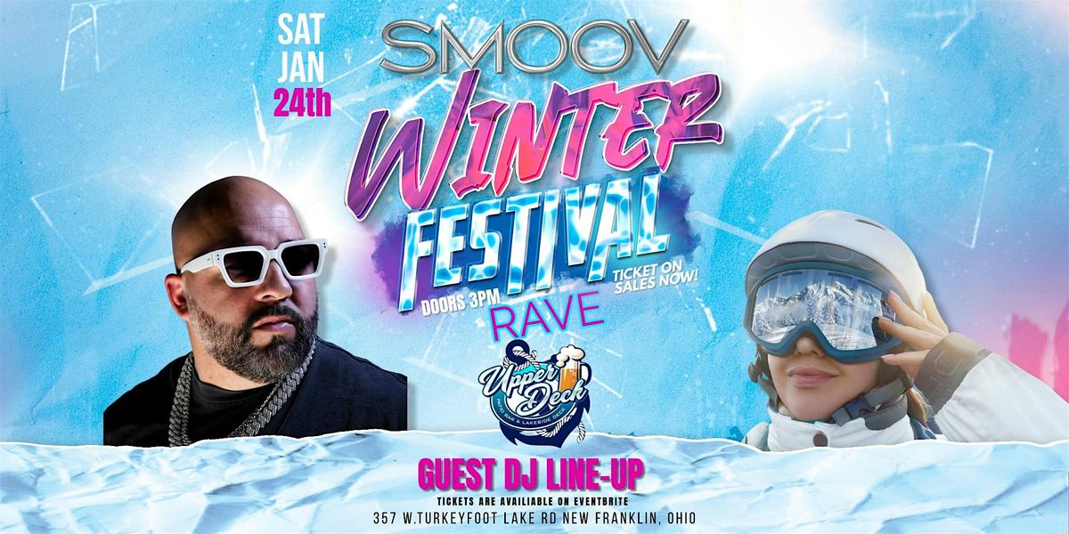 Join us in person for the coolest party of the season! Smoov's Winter Rave Festival is where the beat drops are hot and the vibes stay frosty. Expect epic tunes, amazing crowd energy, and a evening full of unforgettable memories. Grab a unique snow suit, goggles and don’t miss out on the ultimate winter rave experience! we have special guest DJ line-up changing every hour along with DJ Smoov rocking the stage for an epic performance!!!