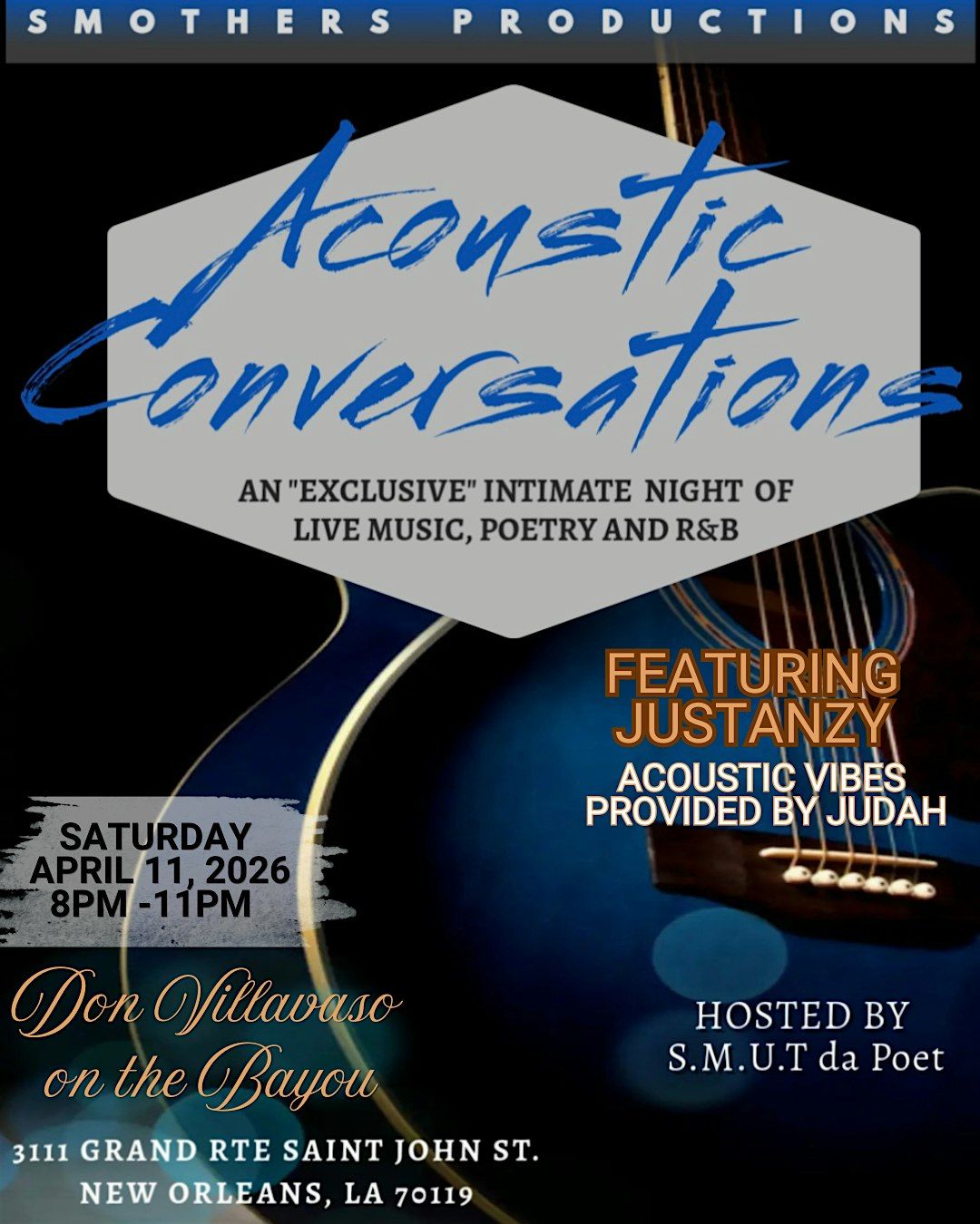 Hosted by S.M.U.T da Poet, Acoustic Conversations is more than an event it’s a safe space for expression, storytelling, and elevated vibes. Whether you're coming for the music, the poetry, or the atmosphere, this experience is designed to pull you in and leave you inspired.