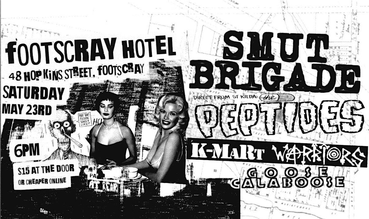 SMUT BRIGADE live at Footscray Hotel w/ friends THE PEPTIDES, K-MART WARRIORS and GOOSE CALABOOSE. SATURDAY MAY 23RD. 6PM.