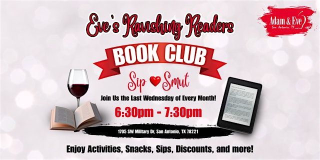 Join us the LAST WEDNESDAY of every month at Adam & Eve 1705 SW Military Dr. Enjoy a fun and laid-back meetup! We'll be diving into some spicy reads and sharing laughs. Whether you're a bookworm or just curious, this is the perfect spot to chill and chat. Enjoy activities with Naughty prizes, light bites, and sips!